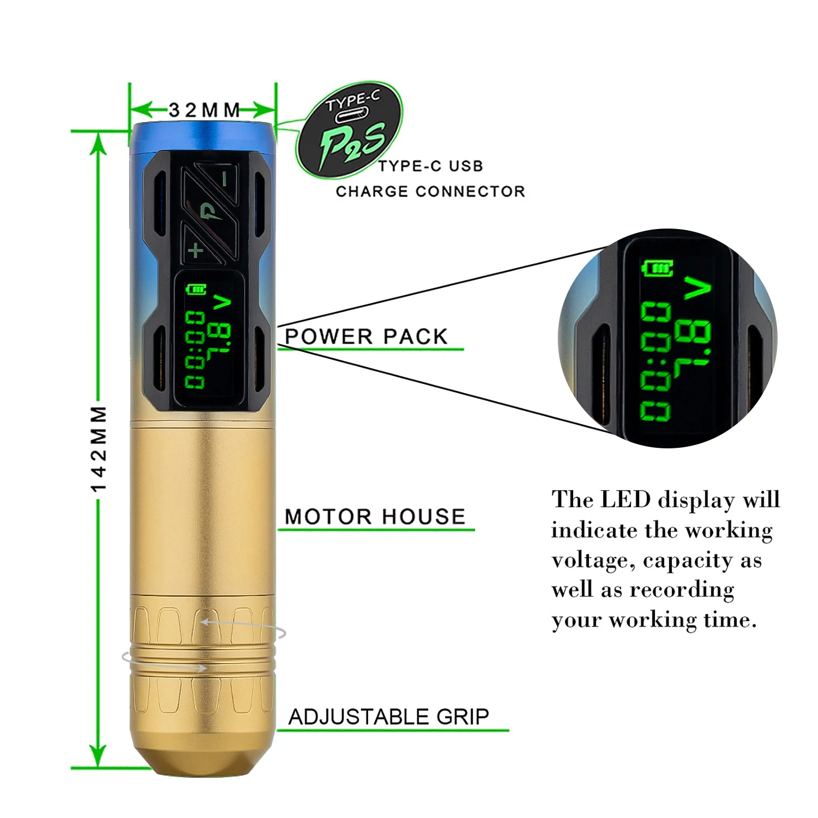 Instead of a traditional pen-style tattoo machine, the P2S isolated the use of tattoo cord to provide freedom on tattooing in anywhere and anyhow you wanted to. and a satisfying tattooing experience comprised of best-in-class EZ customized motor with directly drive system.