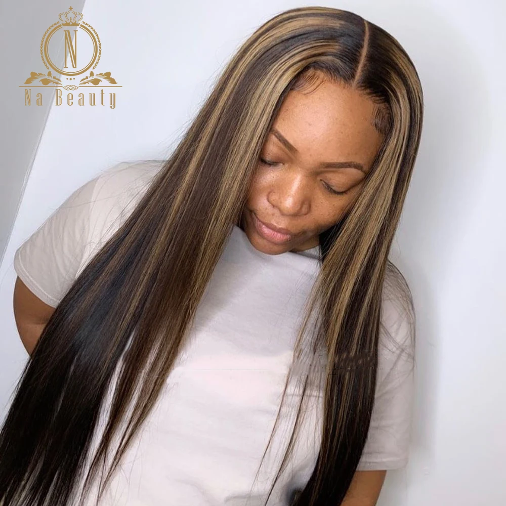Honey Blonde Ombre Straight Highlight Color Hair 4x4 Closure Wig Human Hair Wig Pre Plucked For Black Women Nabeauty Remy 150