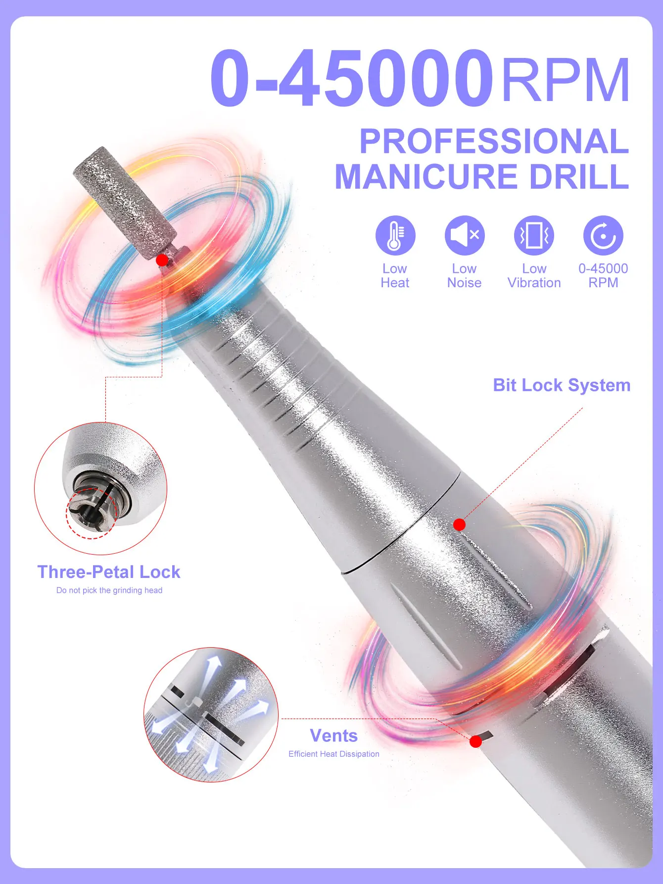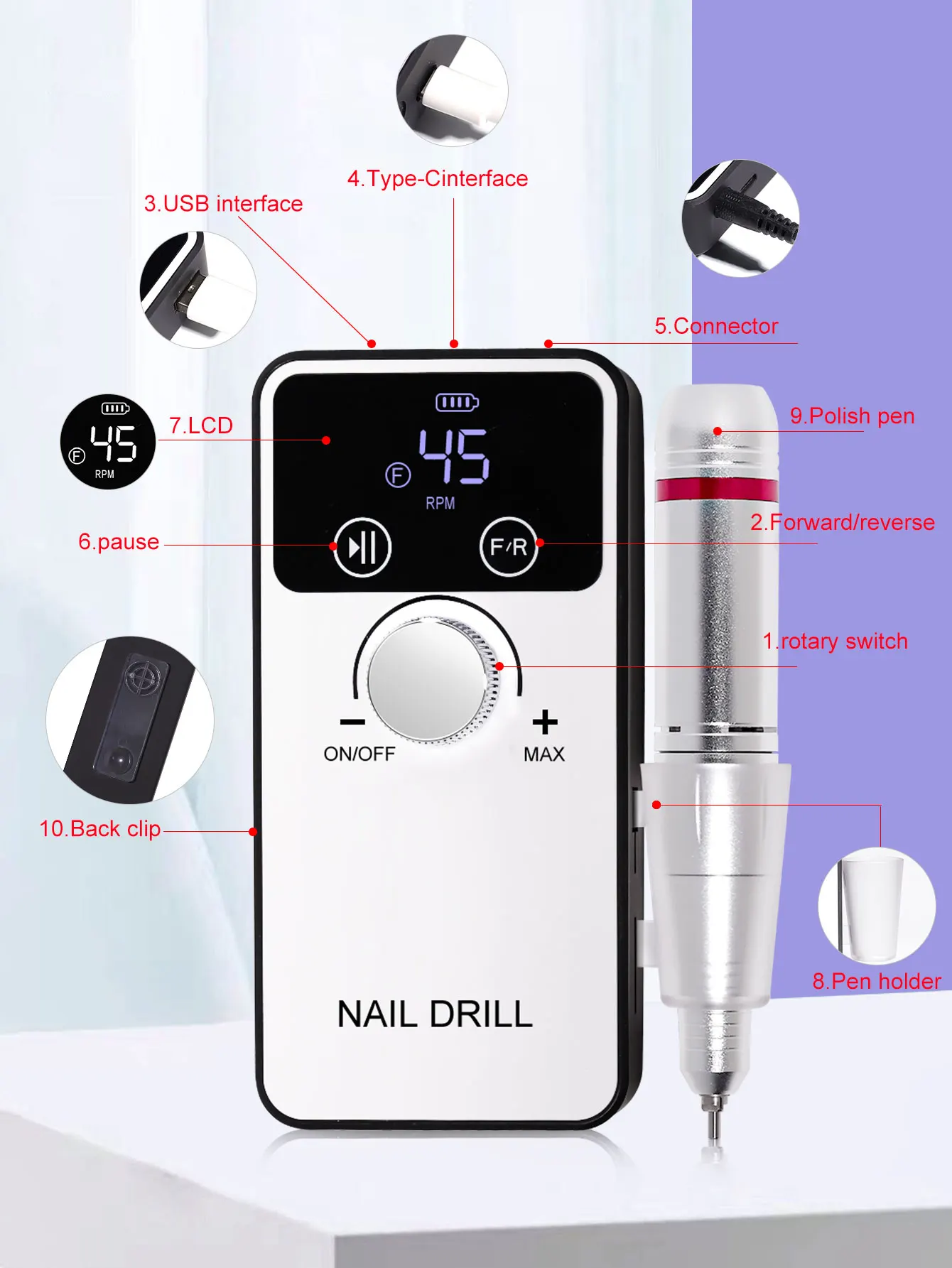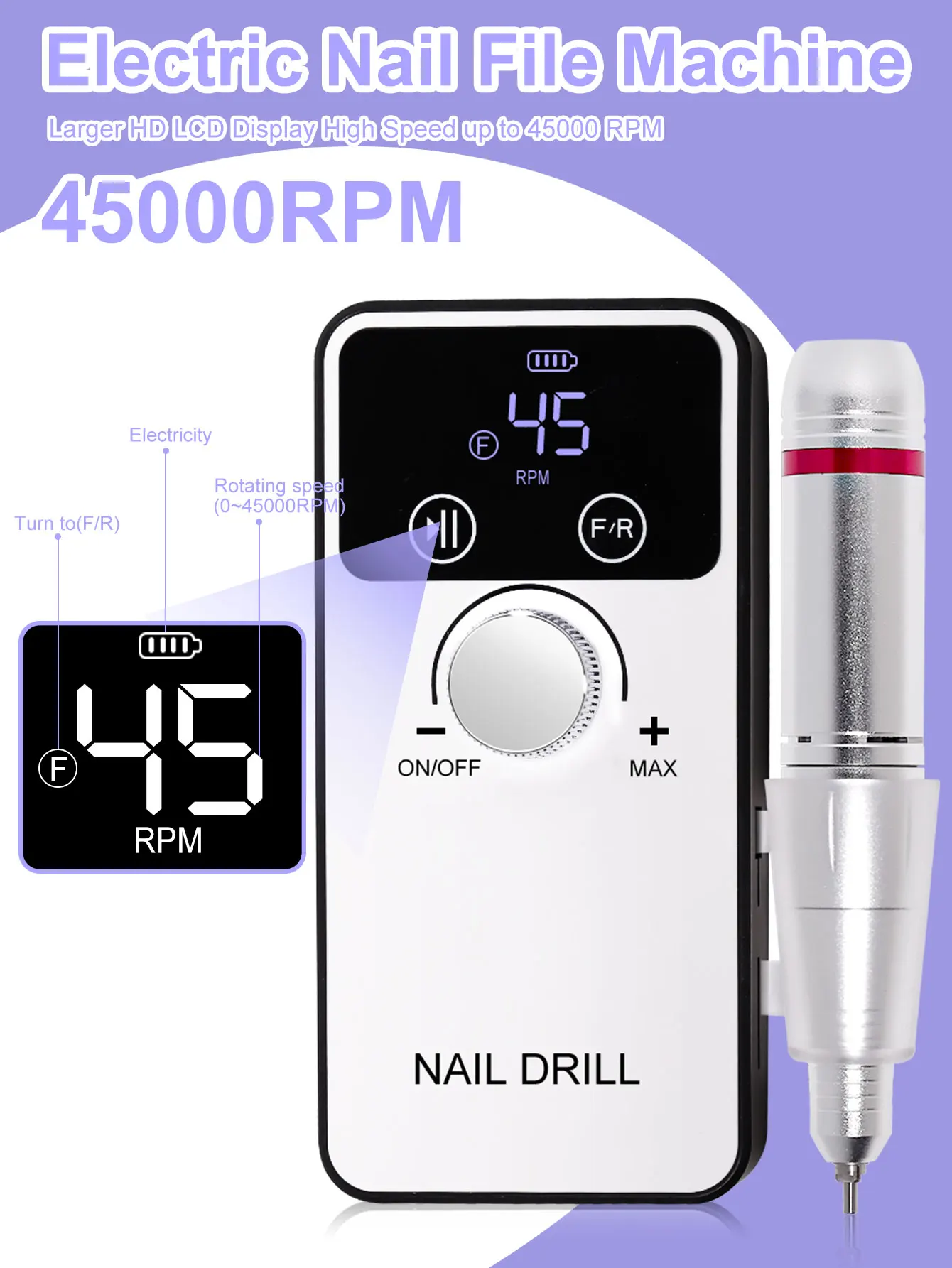 New 45000RPM Professional Electric Nail Drill Machine Rechargeable Nail File Nails Accessories Gel Nail Polish Sander Low Noise