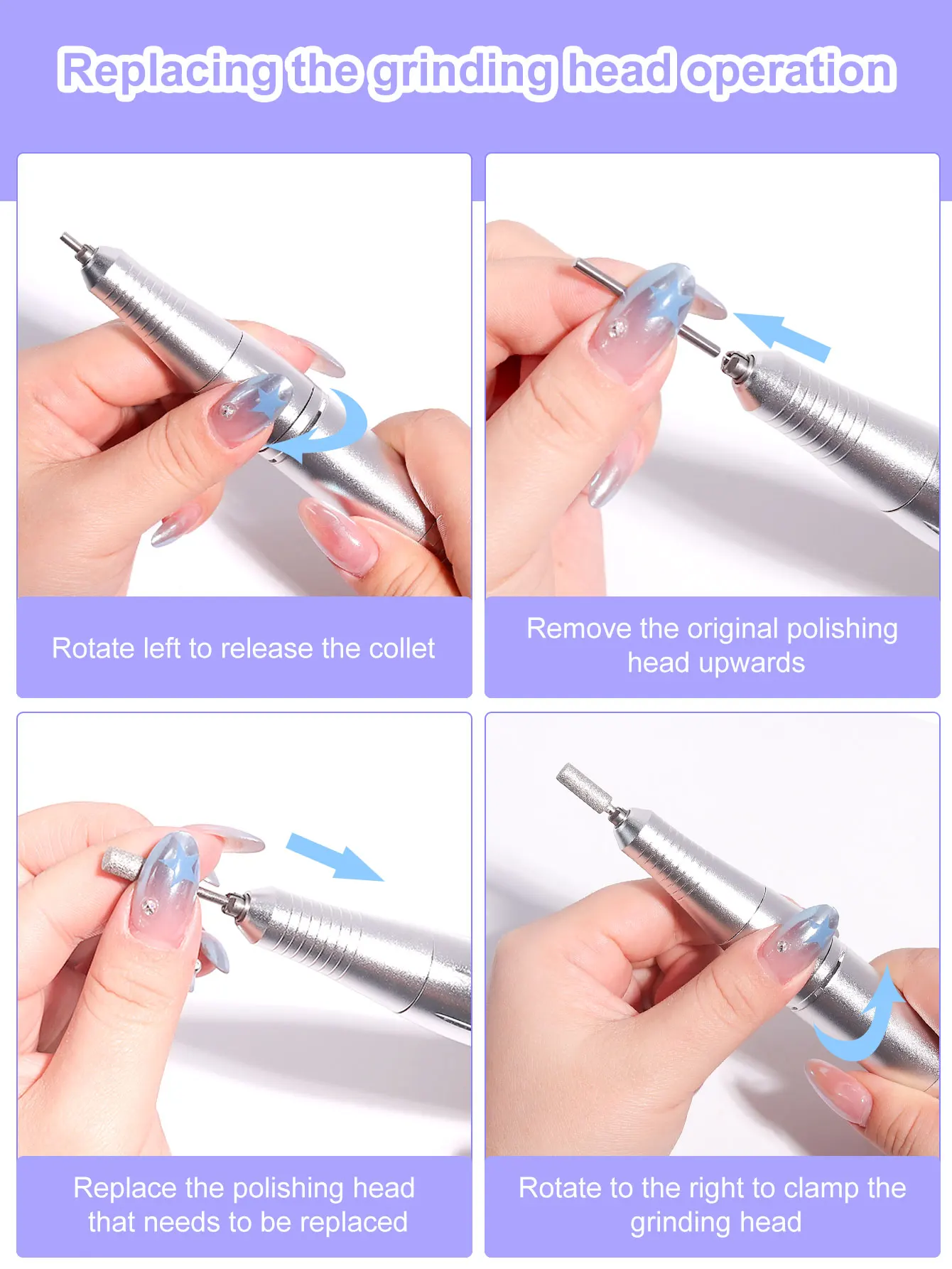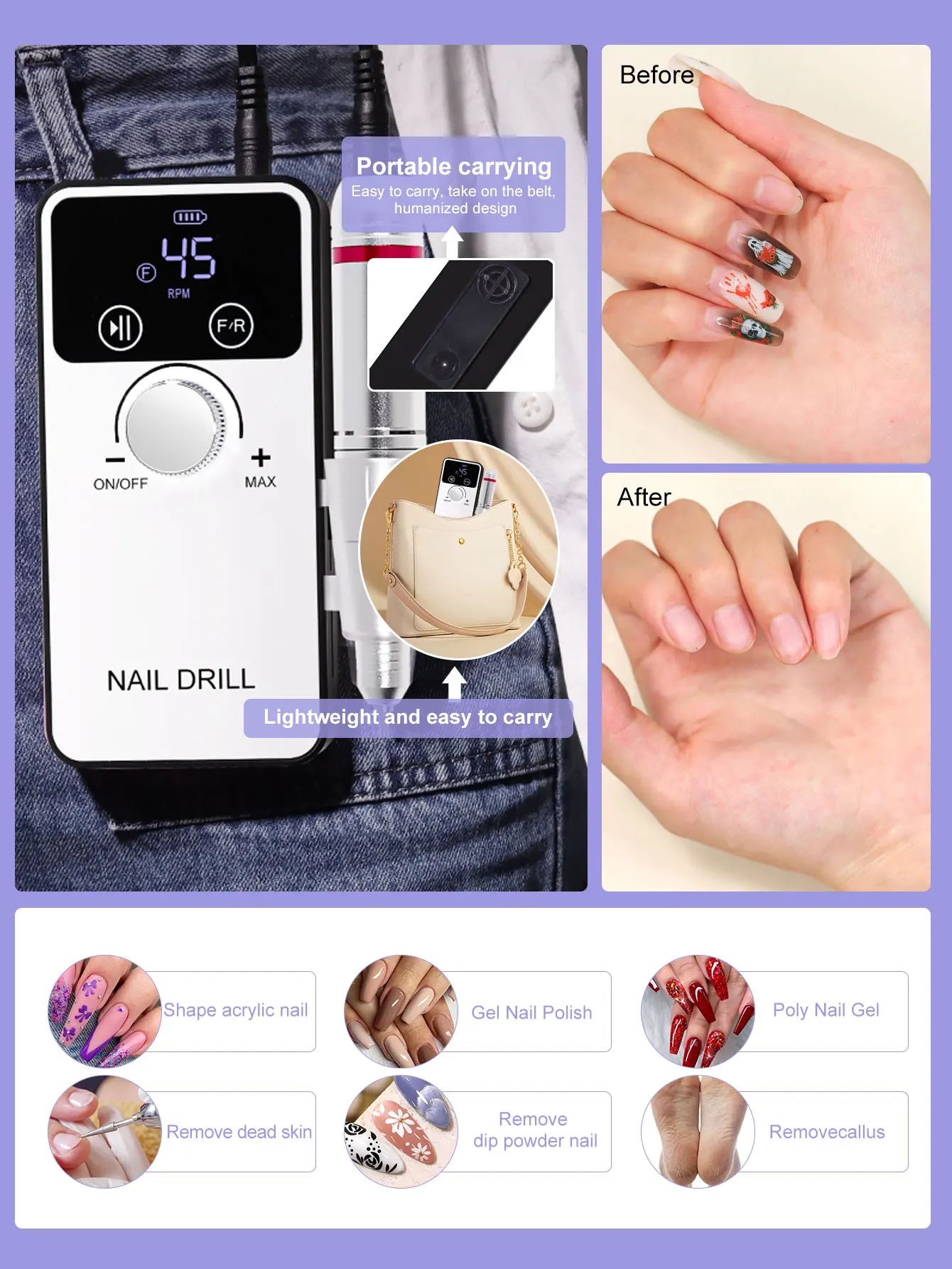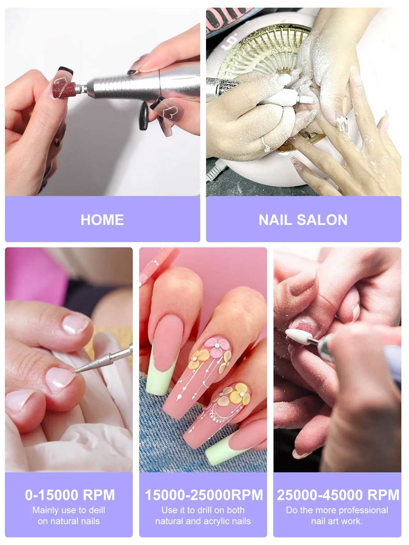 New 45000RPM Professional Electric Nail Drill Machine Rechargeable Nail File Nails Accessories Gel Nail Polish Sander Low Noise