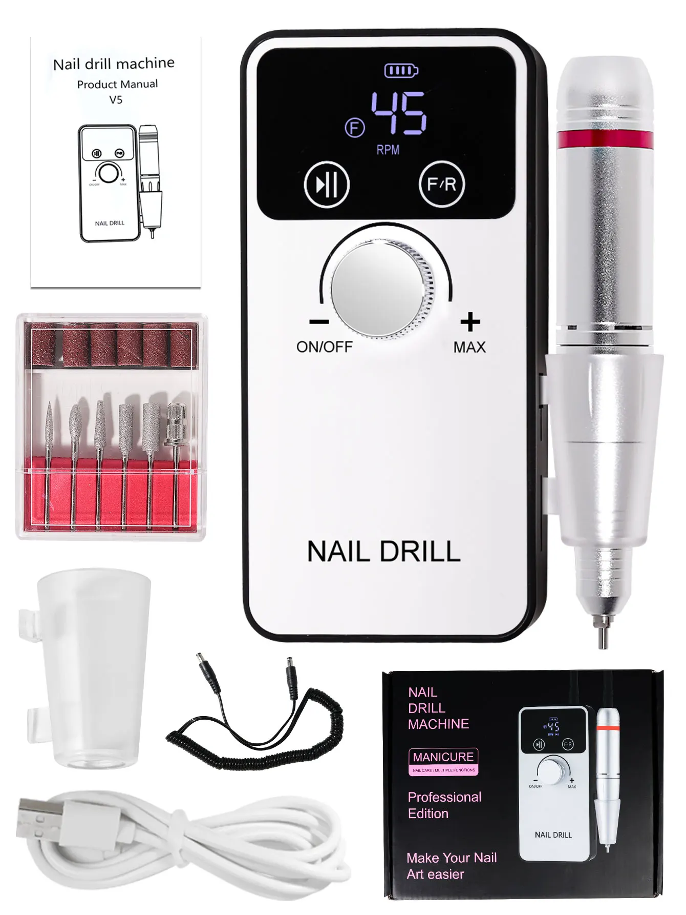 Description Report Item Specification:Product name : Nail Drill machineModel : V5Color: WhitePlugs Type:Type-C USBVariable speed: 0 - 45000RPM (adjustable)Product Size: 145*70*25MM / 5.71*2.76*0.98 inchBattery capacity: 2600mAhCharging time: 2 hoursWorking hours: up to 10 hoursInput voltage : DC5V , 2A Features: 【 Maximum speed 45000RPM】: The rechargeable nail drill matched with...
