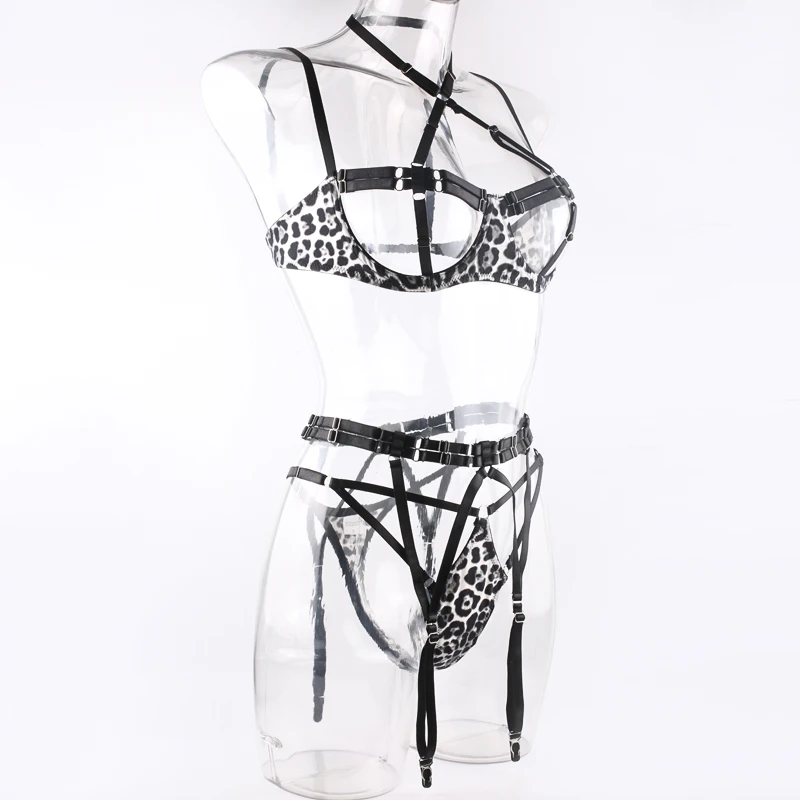 Leopard Bandage Lingerie Set Women Vintage Halter 3-Piece Sexy Erotic Set Cut Out Brief Kit