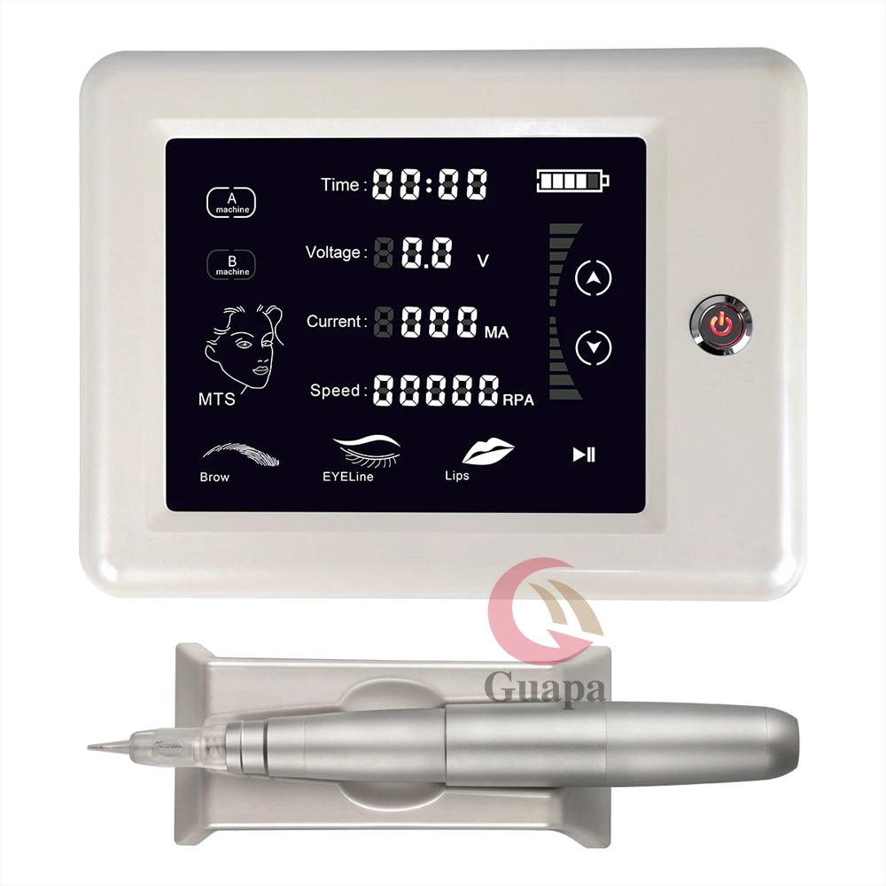 Advantages & Functions: 1: Adjustable 14 Levels Speed, can suitable for Permanent Makeup Eyebrow/Lips/Eyeliner/small tattoo, MTS ect; 2:Preset mode: 4 Modes (Brows/Lips/Eyeliner/MTS); 3:One-button start, Intelligent Panel with TOUCH SCREEN for PMU and MTS; 4:One-touch speed level conversion; 5:Handpiece with Stand Holder, convenient and safe for using; 6:Lowest Vibration for kindly using it, there is no strain on your wrist ; 7:Handpiece satisfying sense of the contemporary design (ergonomic grip design) 8:Working with MTS/PMU needles Cartridge.